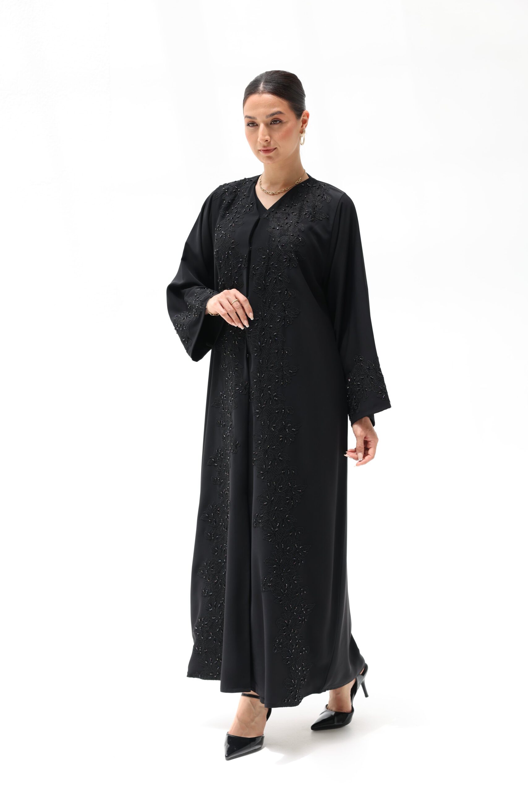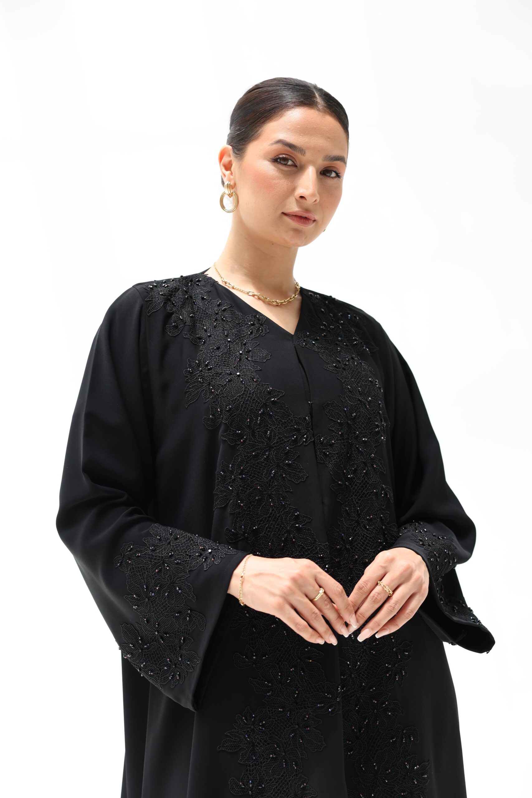 Fine lace base with hand-placed crystal embellishments available in soft high quality nada fabric